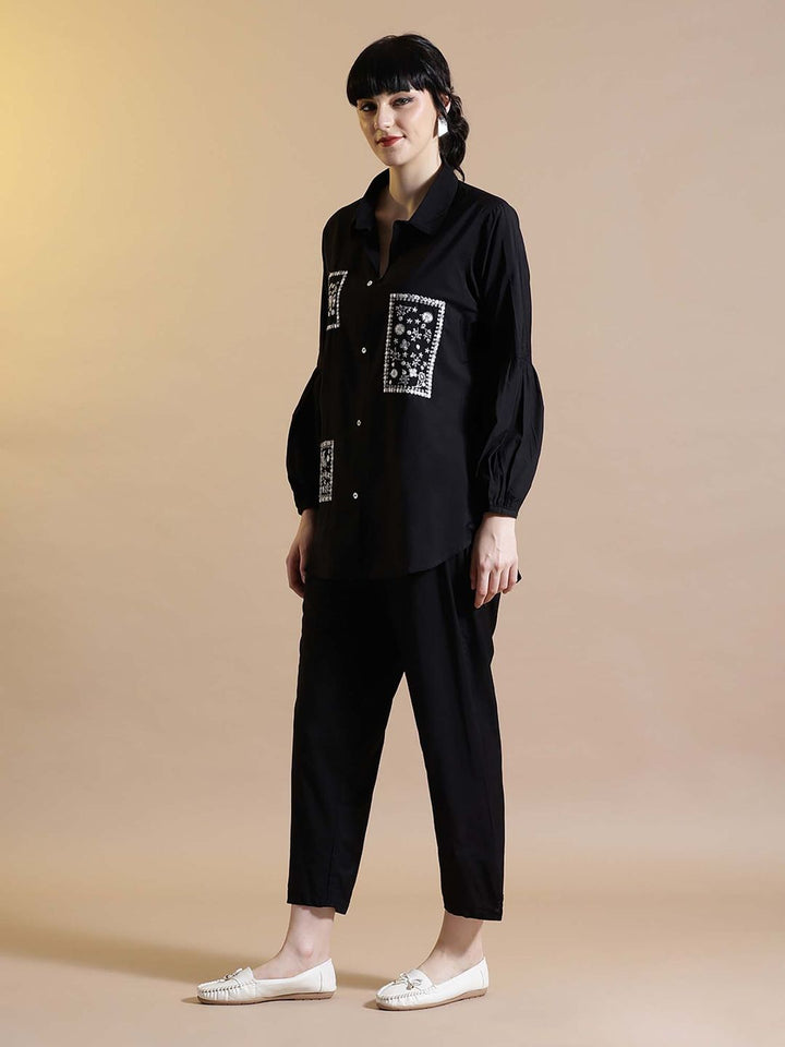 Shirt Collar Embroidered Silk Blend Black Co-Ord (Set of 2)